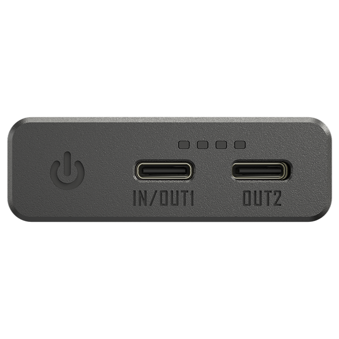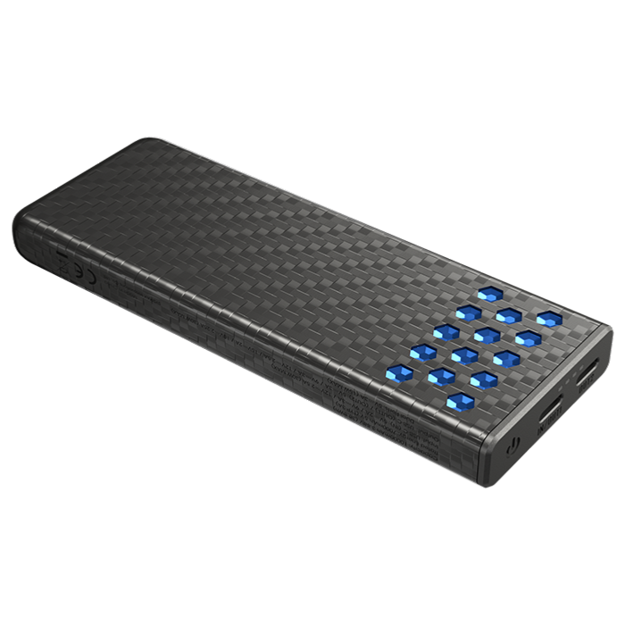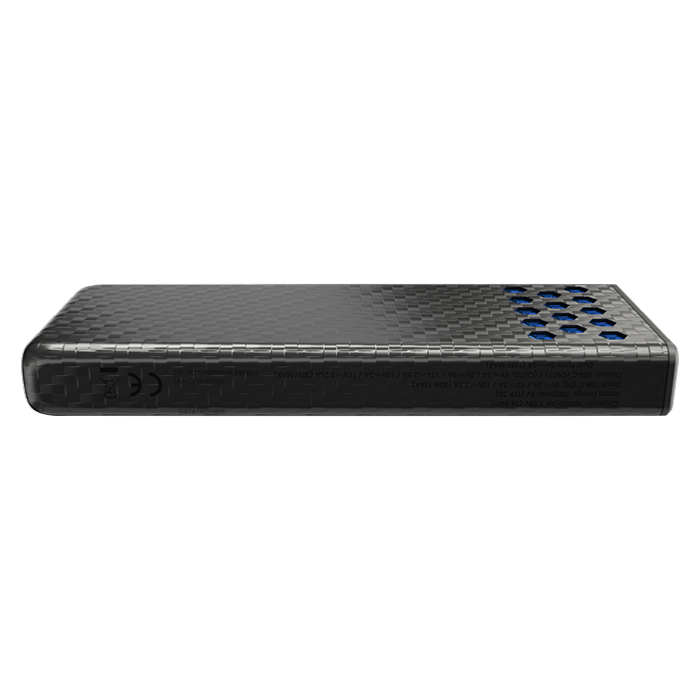 Batterie fabriquée en carbone. Entrée USB-C 30W / 5V-2A / 9V-3A / 12V - 2,5A. Sortie USB-C (30W) 5V-3A / 9V-3A / 12V-2,5A / 15V-2A / 10V-2,25A. Câble USB-C inclus. 4 indicateurs lumineux affichant le niveaux de charge restant.