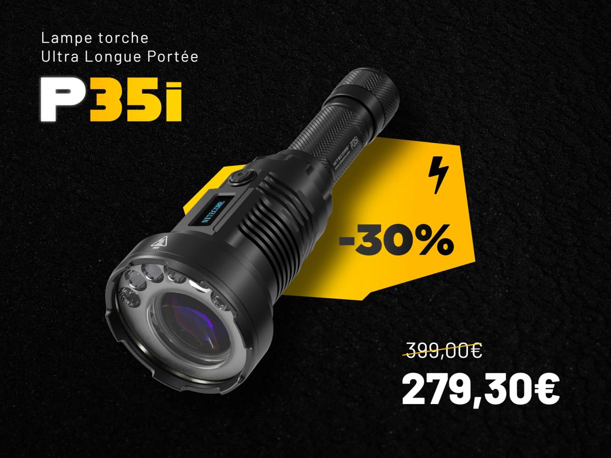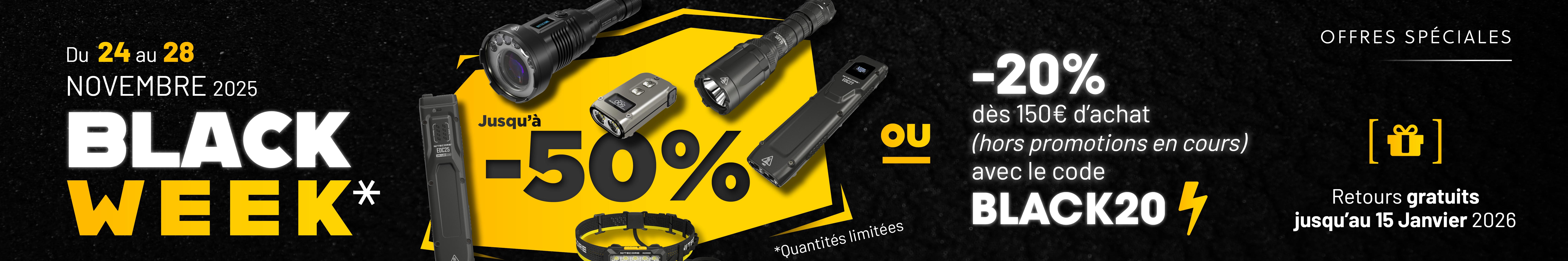 ![]() La Black Week est une semaine où vous pouvez profiter d'une remise exceptionnelle jusqu'à -50% sur une sélection de produits phares ou de bénéficier de 20% de remise dès 150€ d'achat sur l'ensemble de notre site (hors promotions en cours). L'occasion de s'équiper à petits prix : lampes frontales, lampes torches tactiques, batteries externes et bien d'autres encore !![]() EN SAVOIR + La P35i éclaire jusqu'à 1650 mètres de distance et dispose d'une puissance maximale de 3000 lumens. Conçue avec différents modes, vous pouvez éclairer votre environnement soit avec une lumière diffuse (Floodlight) soit avec un faisceau très concentré (Spotlight), en choisissant les deux modes simultanés (Mode Mixte) ou alors utiliser le mode Strobe pour un éclairage tactique momentané. Vous pouvez également via le niveau Preset régler vos propres paramétrages pour choisir la puissance de sortie ou la portée de la lampe.