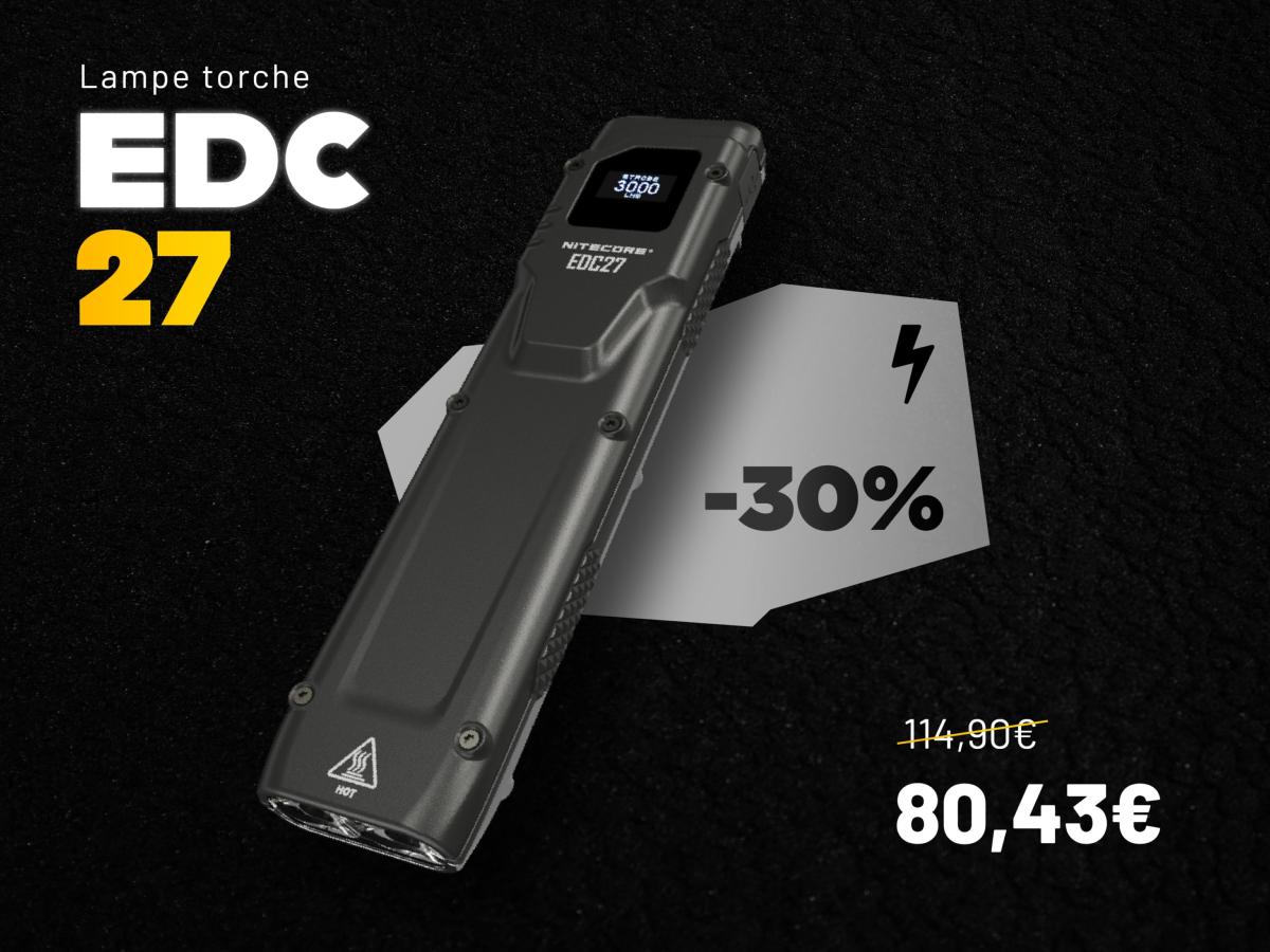 ![]() EN SAVOIR + La lampe torche EDC 27 fait son entrée dans la gamme des lampes torches rechargeables avec une puissance de 3000 lumens et une portée de 220 mètres. Ultra compacte, elle dispose de 5 niveaux de luminosité et le mode strobe avec un accès direct à ce dernier. Elle est conçue avec un double interrupteur pour une utilisation intuitive et sa fonction mémoire vous permet de disposer du dernier mode utilisé en la réactivant.